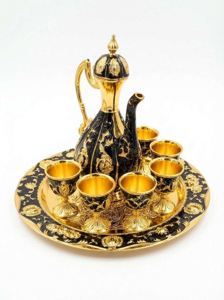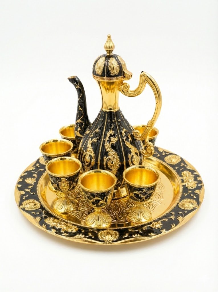 Exquisite Ornate Black & Gold Beverage Set with Tray – 8 Piece