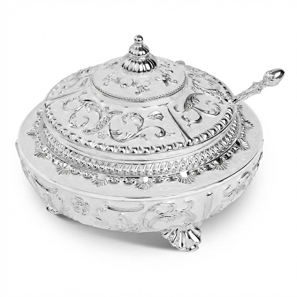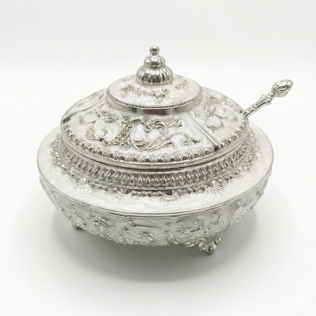 Elevate your table setting with this exquisite silver and white enamel sugar pot. Featuring intricate floral relief patterns and a convenient hinged lid, this footed bowl combines elegance with functionality. It comes with a matching serving spoon, making it perfect for holding sugar, candy, nuts, or even serving as a decorative jewelry trinket box. A stunning centerpiece for tea time or a thoughtful home decor gift.
