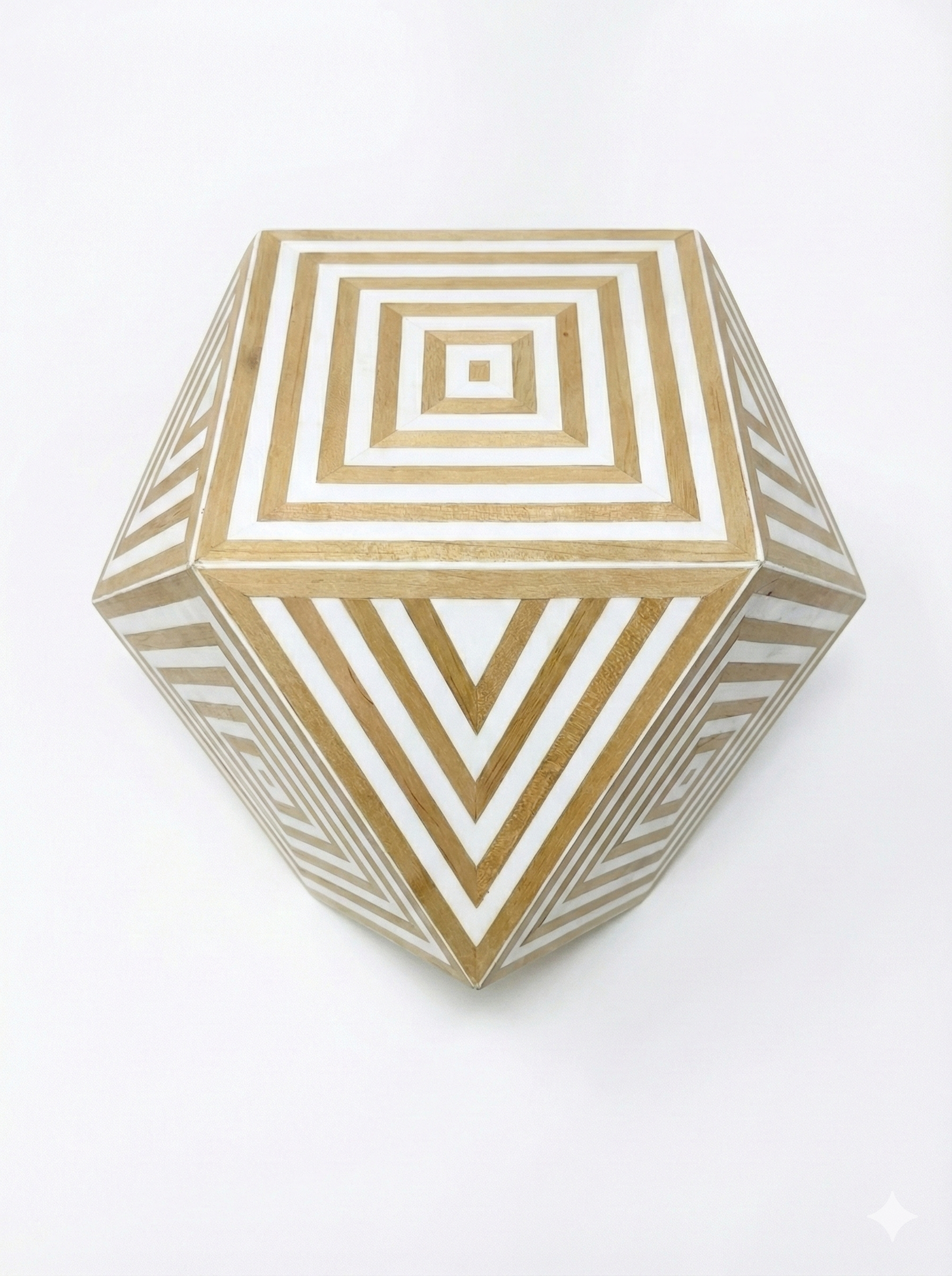 levate your interior decor with this striking geometric side table, a true masterpiece of craftsmanship. Expertly handcrafted, this piece features a mesmerizing optical illusion design created through intricate inlay work. The contrasting natural wood and white stripes accentuate its bold, faceted polyhedral shape, making it a functional work of art.